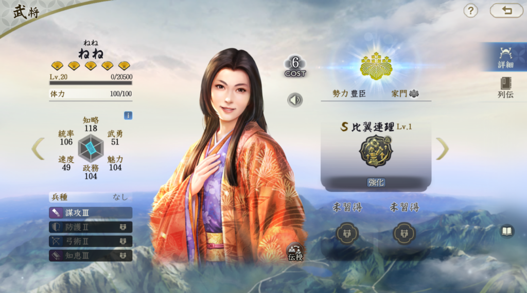 ねね自身はTier2程度の評価なのですが、豊臣秀吉の存在が大きいです。 固有戦法は自軍大将の属性値を参照するため、 ねね自身の属性値は自由に振れます。 将来的には豊臣秀吉以外の武将とも組めるようになると思います。 豊臣秀吉も知略は高いですが、 奇策などで更にダメージを増やす武将ではないので、 ねね固有をより活かした編成が将来的に登場するのを期待しています