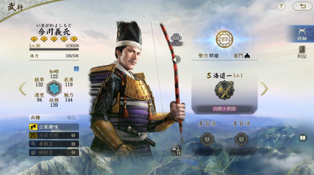 今川義元は武勇・知略が尻上がりに上昇します。 大将技も5ターン目に会心・奇策を上昇させるため、後半型のアタッカーです。 ただ、固有戦法は発動率70%の突撃戦法なので、序盤中盤でも火力を出せるのが 魅力のアタッカー武将です。今川義元は単体として前後挟撃や奮戦などの 連撃戦法+突撃戦法などで組んでも良いですが、文武両道+岐阜侍従などでも ダメージを出せます。長宗我部元親と組む場合は全力戦闘を使うと、 1アタッカー編成でよりダメージが出せる編成ができます。 公式テンプレにもありますが、今川義元+長宗我部元親+寿桂尼などは 今川義元の凸が進んでいるプレイヤーには良い編成だと思います。 地味に武将特性の「公家趣味」が嫌らしい効果です。