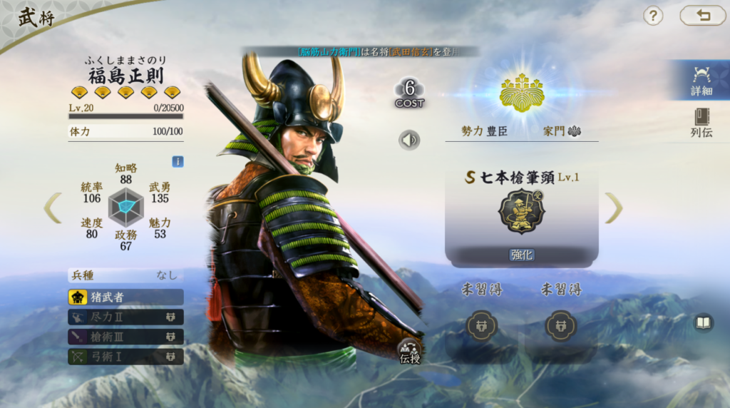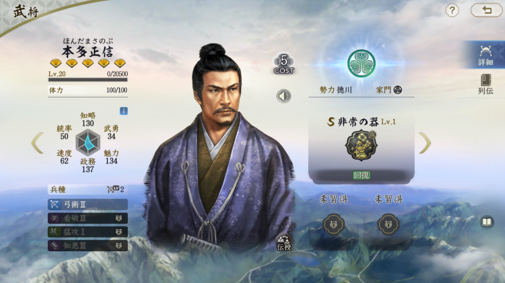 自軍全体への回避35%+自軍全体の回復効果は非常に優秀です。 シーズン1現在は必中を持っているのは太田資正のみなので、 必中による回避対策は難しくなっています。 2ターンまでの効果ではありますが、その後は回復するので、 自軍全体の保護を本多正信固有でこなせてしまうのは強力だと思います 本多正信の難点は統率値が非常に低い点です。 対兵刃にはやや耐えにくい統率値になっているので、 この点は僧兵編成にするとかしなければ、回避効果が終了したあとに 福島正則に狙い撃ちされて被ダメを大きくする要因になってしまいます。