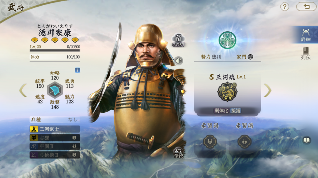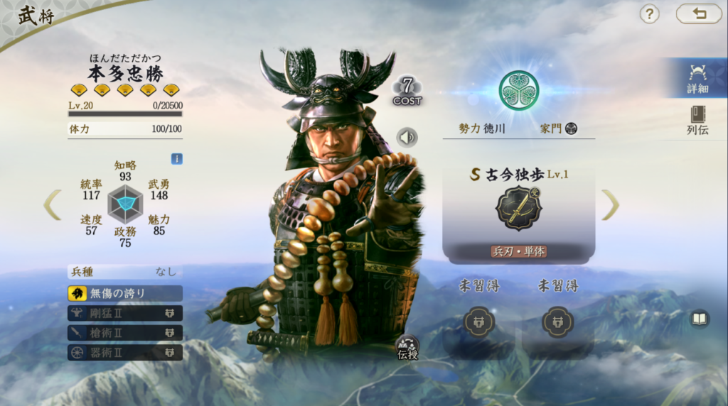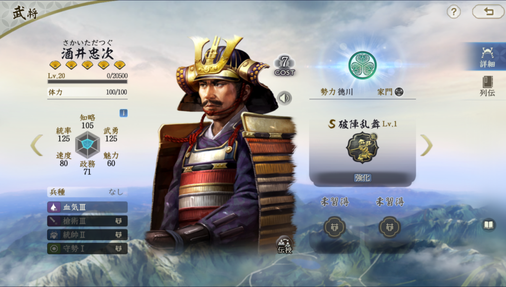 正直言うとTier2にするかを迷いました。 高統率武将はそれほど扱いが難しいからです。 また、反撃系の武将や戦法がもう少しそろわないと 徳川家康の本領を発揮しにくいように思います。 徳川家康+本多忠勝編成は悪くはないですが、 尻上がりに強度差が付いていく編成なので、 それまでに負けることも全然あるので、しっかり耐久力を あげていかないと厳しい編成という認識です。 耐久力を上げる戦法がない場合は酒井忠次を使うほうが まだ編成強度は高いと思うので、徳川家康をわざわざ使うほどでは と思ってしまうので、Tier1は評価高すぎかな?と思う反面、 僧兵を使った対兵刃編成に絞って、奇謀独断などで戦法発動を 妨害してやれば強度は出せるとは思ったので、 ギリギリTier1にしました。本多忠勝の評価も低いので、 限りなくTier2に近いと考えてください。