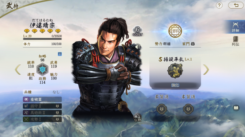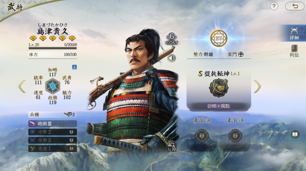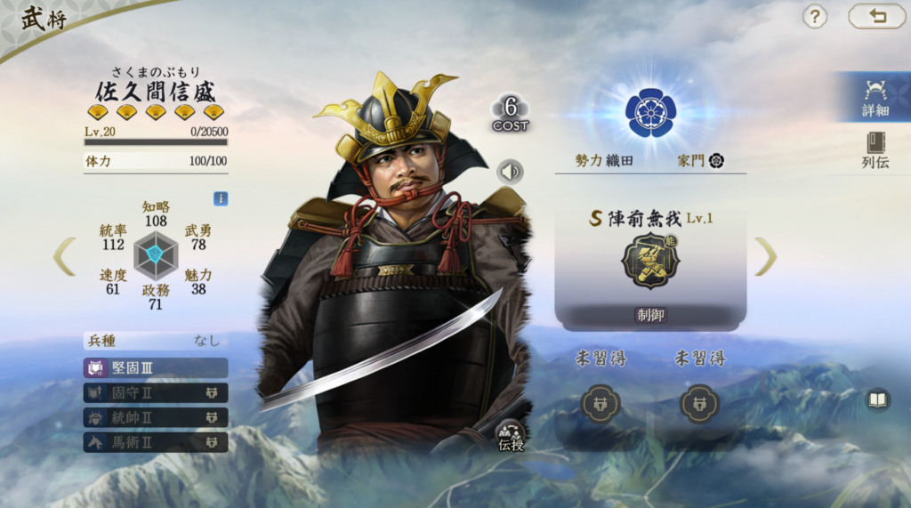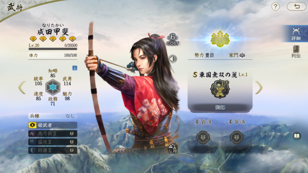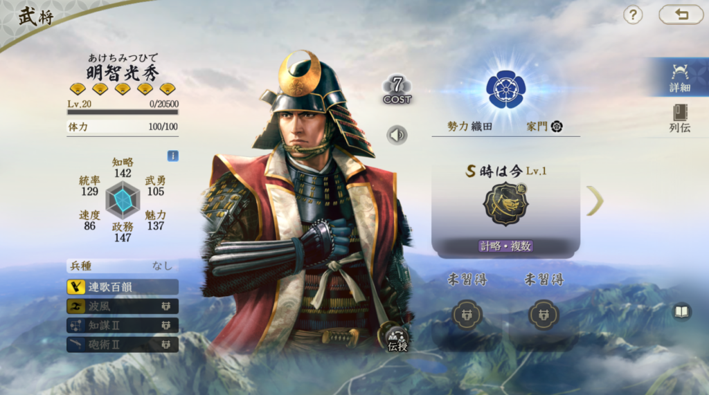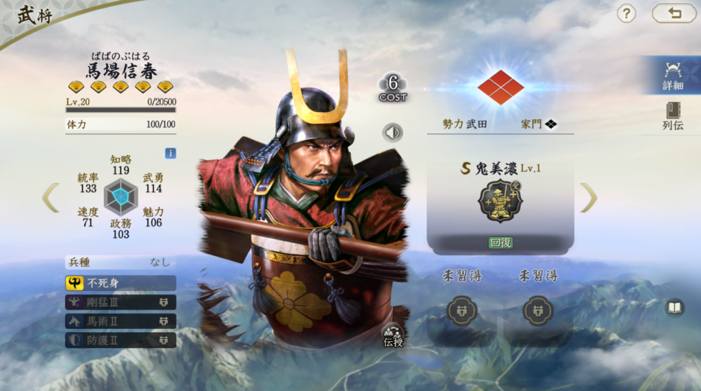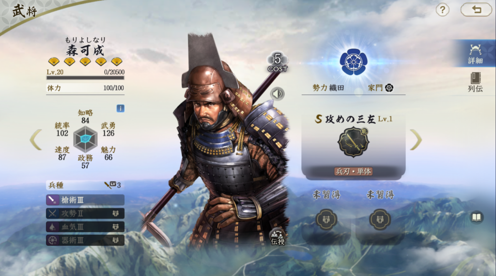 比較的安定して火力が出せる武将です。 ただ、兵刃火力はそれほど高いわけではないので、 柴田勝家や明智光秀を所有していない場合の 織田信長編成の代替武将としての役割を担う存在だと思います。 それ以上でもそれ以下でもないのでTier3評価です