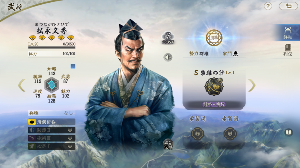 松永久秀は発動率35%+準備ありで非常に思い固有戦法を持っています。 しかし、その火力は非常に高いポテンシャルを持っています。 火傷付与できる点も評価ができ、対僧兵に強みがあります。 基本的な運用は一行三昧や甲斐弓騎兵などの発動率UP戦法と合わせて、 使用するのをお勧めします。個人的には竹中半兵衛よりは評価が上です。 ただ、群雄勢力は他に優秀な武将も多いため、最優先で組む理由がありません。 他に計略アタッカーがいない場合は使うといった形になると思います。 火力は高いですが、ダメージ発生がやや遅い点が難点で、 しっかり耐久できる編成にすることが求められます。 基本的には大将で編成したい武将です。