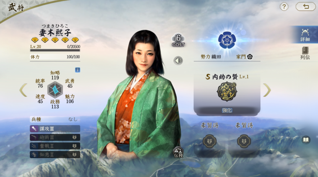 妻木熙子の固有戦法は継続状態の持続ターンを1ターン伸ばします。 偶数ターンで敵軍全体が継続状態の場合は自軍全体を回復します。 現状妻木熙子を編成するのは明智光秀とセット以外では難しいです。 特に偶数ターンに敵軍全体が継続状態という条件を満たせるのは、 明智光秀くらいだと思います。 編成幅が現状はかなり狭く、自軍全体を回復する条件が厳しいので、 やや使いにくい武将だと思います。 継続状態の持続ターンが伸びる効果自体は強いので、 Tier2評価としました。