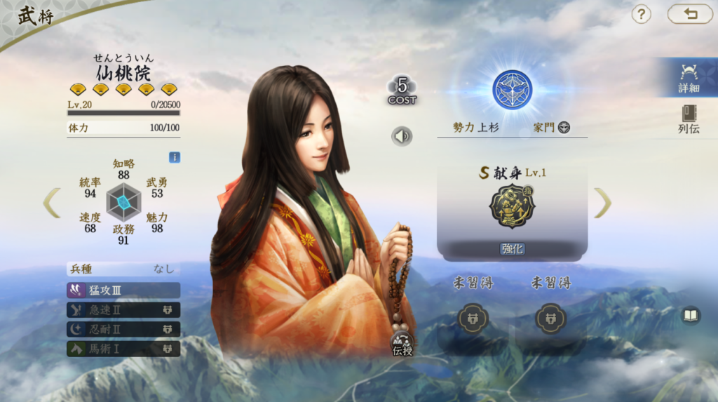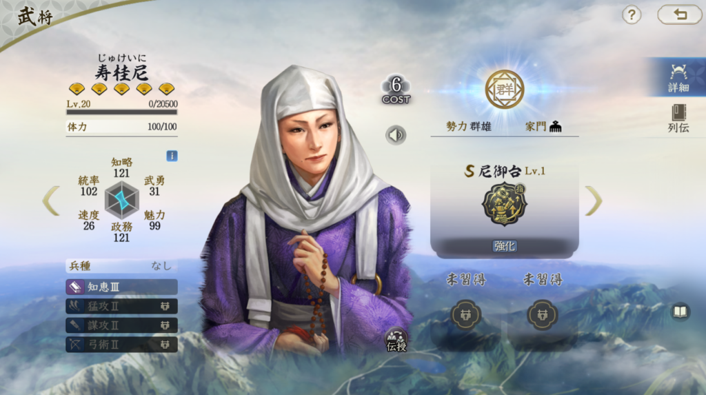 寿桂尼は自軍大将に2ターン目まで洞察を付与し、 被ダメージを低下させます。効果終了後は離反・心攻を付与します。 最も相性が良いのは今川義元大将の編成になります。 気炎万丈による封撃を無効化できますし、離反と心攻を活かしやすい武将です 今川義元は単体火力もそれなりに強力ですし、安定したダメージを出せます。 寿桂尼編成の大将は強力なアタッカーじゃないとあまり意味がありませんが、 現状1アタッカーで倒しきれる火力を出せる武将は多くはないので、 やや影が薄めでしょうか。今組むとしたら、今川義元+長宗我部+寿桂尼が 良くて、長宗我部がない場合は伊達晴宗や毛利元就などの サブアタッカーを担える武将が良いと思います 洞察付与はシンプルに強いので、将来的には主編成に入ってくる可能性は高く ポテンシャルは充分だと思います。