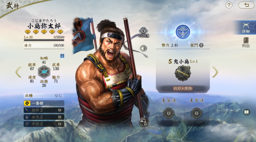 小島弥太郎は上杉編成では主編成に入ってきます。 固有戦法は発動率が高く、序盤からダメージを出しやすいため、 スタダ編成でも活用ができます。コストも5と高くないため活用しやすいです 基本的には連撃+突撃戦法の編成法で問題ありません。 シンプルに使っていけるのも魅力でしょうか。 宇佐美定満と使う場合は封撃耐性を含む制御耐性が得られるので、 割と安定した火力が出しやすい勢力環境があります。