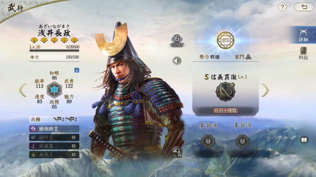 浅井長政は課金するともらえる配布武将です。 現在外見も販売されていますが、課金した人向けに外見販売しているのは、 ある意味初心者から回収する気満々にみえてしまいます。 シーズン2からは浅井長政をスタダで使う理由はほとんどなくなるので、 そういう意味では旬が過ぎた武将といえるでしょう。 では弱いかといわれるとギリギリTier2に入るかな?といった武将です。 課金配布武将の浅井長政はスタダや対人で絶妙な強度をもっています。 対人では強すぎず、弱すぎず、テンプレ編成に勝ちを拾うのは ややハードルは高く、微課金編成には勝てる程度の強度です。 シーズン2以降では使用率は激減する筆頭武将だと思います。 今季運営のバランス調整の見事さはこのあたりに表れていると思いました 武将特性も使いやすく、固有戦法も平均よりやや上、 大将技も使いやすく、リターンが得やすい設計になっています。 もう少し勝ちたかったら課金するとよい、という声が聞こえてきます。