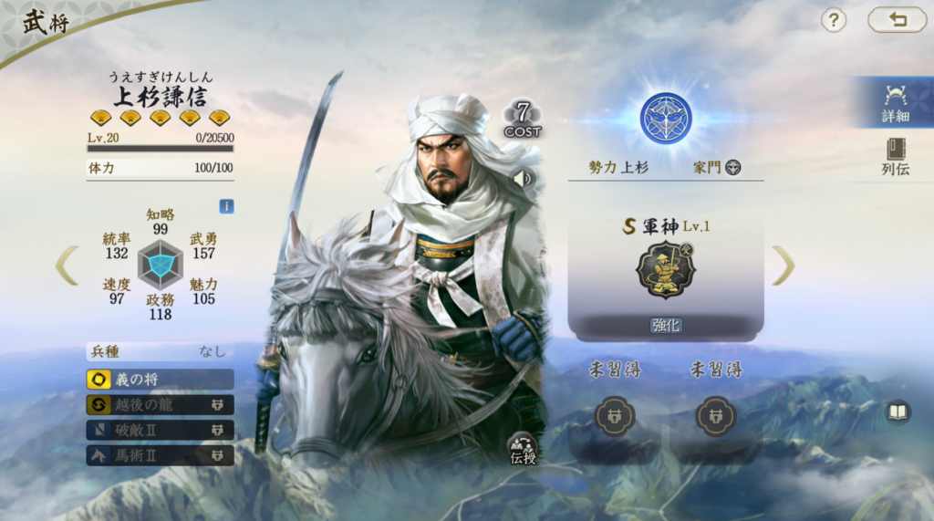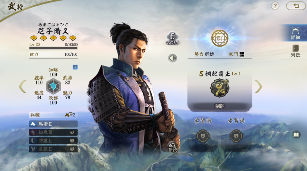 コスト5だけあって、属性値は低いです。 固有戦法は発動率50%+準備あり戦法で、2ターン威圧を付与できます。 基本的にはサブアタッカーの役割も厳しいスペックですが、 2ターン威圧は悪くありません。 運勝の鼻と相性が良く、準備スキップで即発動であれば、 中々強力な制御戦法として活用はできます。 スペック的には評価低いですが、威圧2ターンはTier3相当だと思います