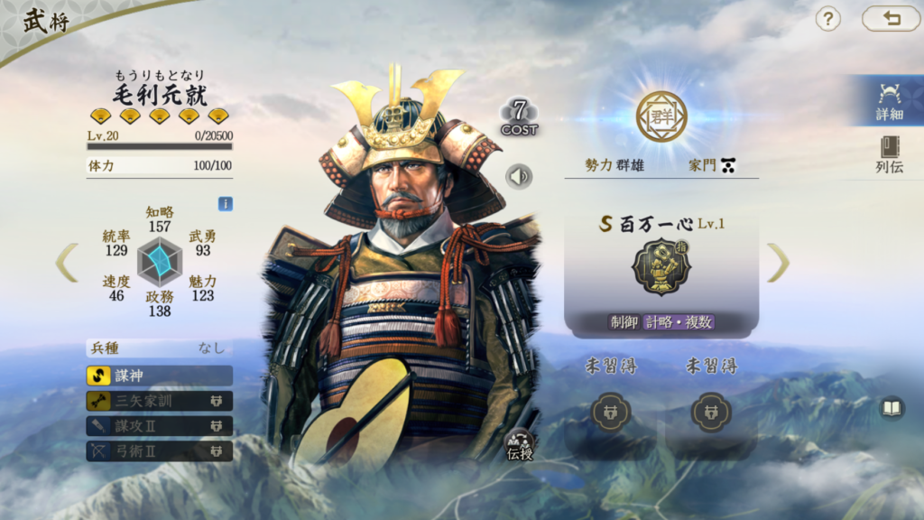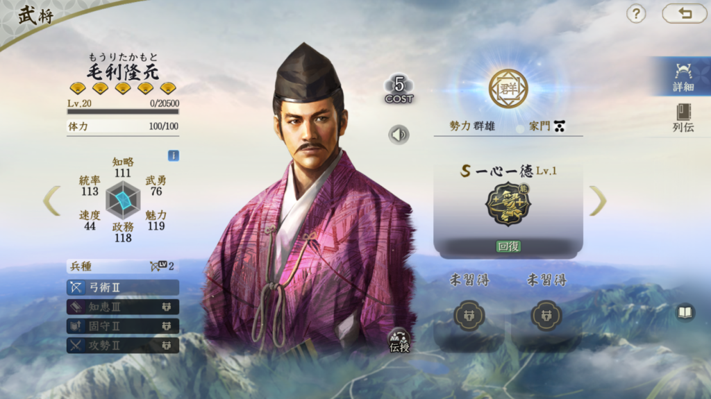 毛利隆元は草木皆兵の戦法伝授ができるため、 基本的に戦法伝授のための武将として認識されてそうな武将です ただ、使っても意外と使えるのが回復武将の強みでしょうか。 コスト5の武将なので属性値は高くありません。 ただ、固有戦法の発動率は50%と高く、即時回復+休養と 回復頻度が多いのが特徴です。 信長の野望真戦は回復戦法は充実していますが、 重課金者は部隊数を多く組むので、それでも足りないなあと思います 微課金者は回復戦法の多くは低排出武将を含むので なかなか手に入らないと嘆いていると思います。 そこに毛利隆元はちょうどハマる武将だと思います。 例えば松永久秀や北条綱成、本願寺顕如編成などの群勢力編成を 組む場合は毛利隆元を編成に入れれば回復戦法の枚数を減らせます 高排出武将なので、比較的凸もしやすい武将というのも利点でしょう。 戦法伝授だけじゃなく、武将としても使って良いと思っています。