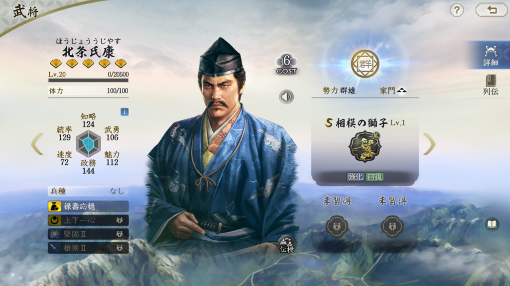 Tier0武将の筆頭は北条氏康です。 北条氏康は自軍全体への鉄壁2回効果が非常に強力です 発動率も良く、一行三昧や甲斐弓騎兵を合わせると67%になります。 鉄壁効果は現状必中を付与できる武将は太田資正のみなので、 必中で対策するのは難しくなっています。 手数を増やすか、無策を付与するのが対策になるでしょう。 手数が少ないロマン砲編成の天敵ともいえる武将です 武将特性も強く、特に1凸の上下一心は1ターン目に制御耐性を獲得し、 30%の確率で制御状態を無視します。 地味に大将技も強く、実質的な回生効果ともいえます。 被ダメが少ない攻撃の場合は回復が上回る場合もあると思います。