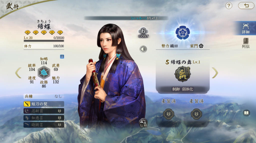 帰蝶の固有戦法は受動戦法です 奇数ターンに38%の確率(知略依存)で統率と知略を22%低下(知略依存)、 偶数ターンに38%の確率(知略依存)で2名に混乱付与(1ターン持続)。 悪くはありませんが、やや補助としては微妙でしょうか。 受動戦法なので、浄化はされませんが、持続ターンが1ターンしかないのは やはり微妙だと思います。 発動率は38%(知略依存)なので、それほど発動するわけではありません。 出来れば、1~2ターン程度の変動込みで弱体状態を付与できれば 使える武将だったと思いますが、発動率の低さと持続ターンが1ターンは やや微妙といったところです。 大名武将と同等の低排出の割には弱い外れ枠になっているのが残念です。