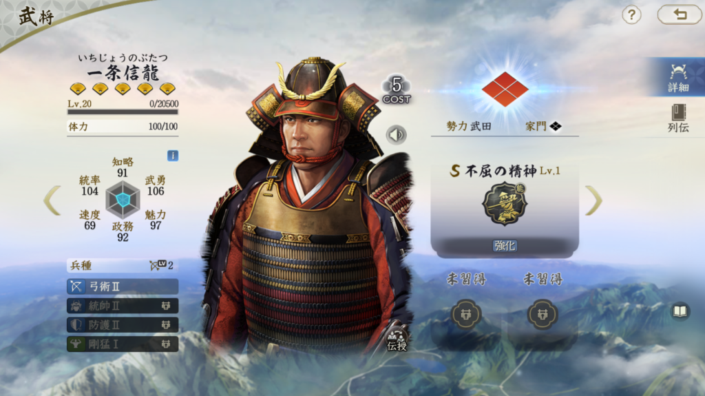 一条信龍を主軸にした反撃編成も少し検討しましたが、 固有が発動しなければ本多忠勝未満でしかありません。 徳川家康の1凸特性「古狸」を使った一条信龍編成も検討しましたが、 やや厳しいかなという結論です。 反撃のダメージ率は148%と高く、武勇が36ずつ重ね掛けできる点は 魅力ですが、現状の環境では反撃編成はまだ成り立ちにくい印象です。 そのため、一旦Tier3評価とします。
