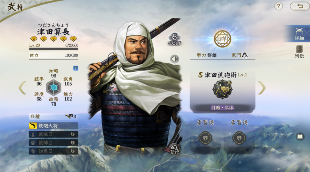 津田算長の固有は2ターンの間、封撃、無策、威圧、混乱を付与し、 ダメージを与えます。制御戦法としてはランダム性はあるものの、 悪くはない性能です。しかし、発動率は30%なので、やや低く、 一上一下などで発動率を高めないと制御効果は期待しにくいと思います。 基本は戦法伝授優先で良いと思いますが、 どうしても群武将が足りない場合は制御付与のサブアタッカーとして 使用を検討してください。基本スペックだけならTier4に近いです。