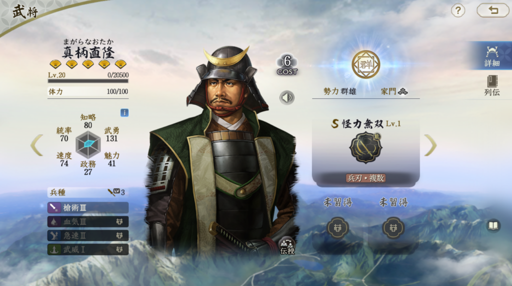 突撃戦法が固有の武将ですが、ダメージ率はそこそこで、 追加効果は「次の」計略ダメージが75%減なので、 実用性はそれほどありません。 突撃系武将の中でも下位評価になります。