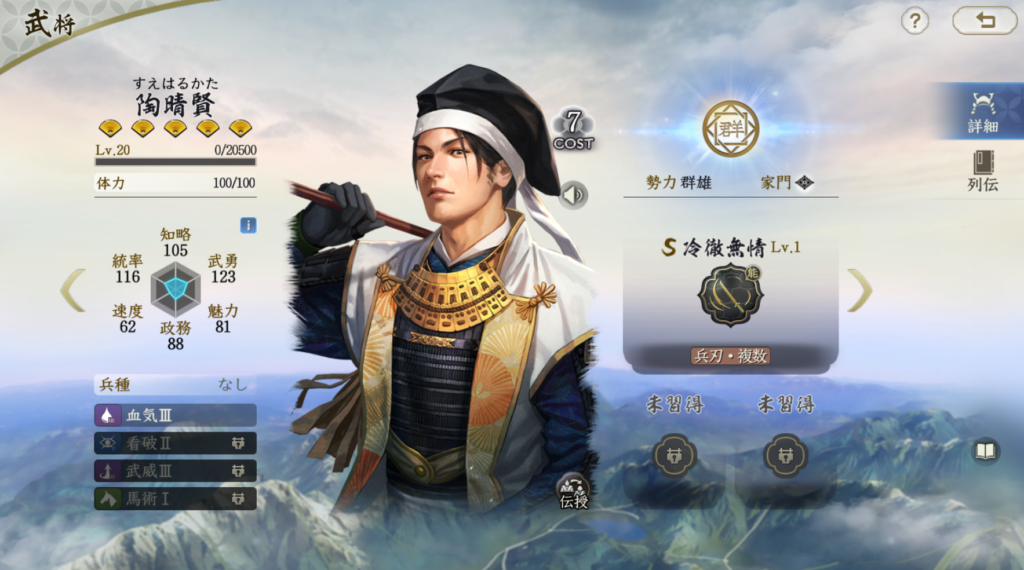 陶晴賢はコスト7武将ですが、配布武将だけあって 属性値はそれほど高くありません。 固有戦法は弱ったやつに強いというタイプなので、 そこに至るまでの戦法がほしいのに、そこをスルーしてる 戦法にはあまり用がありません。 ダメージ率はそこそこ高いですが、コスト7に求めている 高属性・高火力・固有戦法の強度、いずれも持っていない武将です。 微課金なら使う機会はあるかもしれませんが、 将来的には入れ換え候補になると思います。