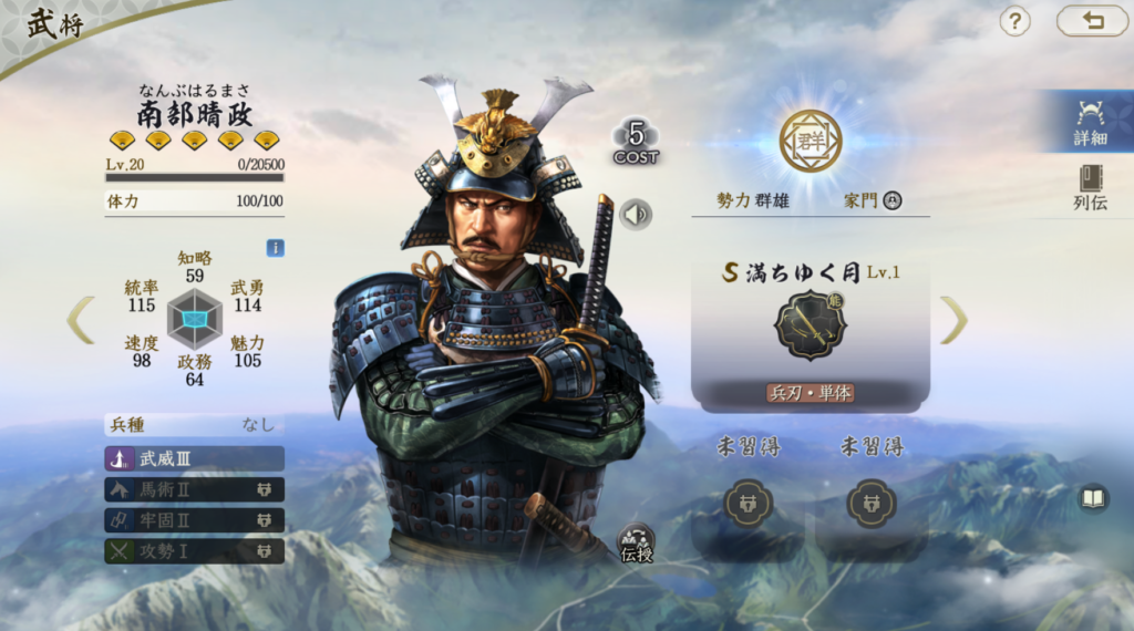 南部晴政の固有戦法は発動率50%+準備ありの兵刃火力戦法です。 特徴的なのは持続ターンの長さです。4ターン持続の潰走を付与し、 大将の場合は戦闘終了まで持続します。 それだけ見ると強そうに思えますが、南部晴政の課題は、 武勇がそれほど伸びないこと、ダメージ率自体は高くないこと、 すでに潰走状態中の対象は次の2回の与ダメージが40%低下するだけで 火力は伸びない点です。 南部晴政はダメージの発生が遅く、1回のダメージが弱く 火力勝ちしにくい武将です。運勝の鼻とも相性が良いとは言えないため 現時点では伸びしろが低い武将ですが、8ターントータルで考えれば それなりに安定してダメージを稼げる武将ではあります。 なので、Tier3とします。