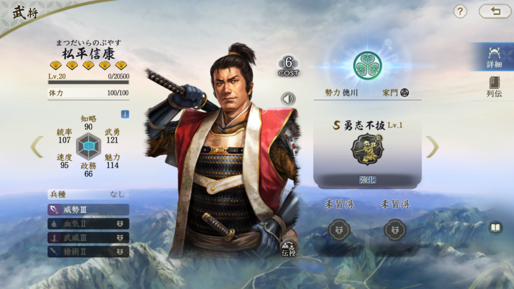 松平信康は属性値は決して高くはないものの、 全体的に悪くはありません。 しかし、徳川家は兵刃アタッカーが割とそろっていて、 出番があまりありません。 筆頭は酒井忠次、そして次点に榊原康政です。 松平信康は固有でダメージが出せればより良かったですが、 自身への強化と肩代わりです。 うまくいけば被ダメージを吸収しながら離反で回復し、 ダメージを出せる機会があるかもしれません。 しかし、うまくかみ合わないケースも多そうなので、 固有でダメージを出せるタイプのアタッカーのほうが 安定した活躍を見せてくれると思います。