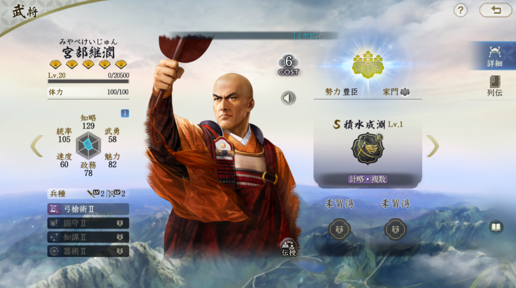 宮部継潤の固有は35%発動+準備ありとやや重めの戦法です。 自軍複数に心攻付与し、敵軍複数に水攻めを付与しダメージを出します。 補助と火力が両立しているので、悪くはありません。 ただ、豊臣家は兵刃・計略アタッカーが確立されているので、 それほど出番がありません。基本的には、心攻付与を活かすために 全員計略アタッカー編成で使うのがお勧めですが、 宮部継潤固有を最優先した編成を考える必要はまったくありません。 例えば、豊臣秀吉+竹中半兵衛+宮部継潤といった編成もできますが、 宮部継潤外して、豊臣家の別の武将にしたほうが強度は上がると思います 宮部継潤は知略が高く、統率はそこそこ高いです。 戦法伝授の僧兵は統率の影響を受ける兵種戦法で、 宮部継潤が僧兵を装備した場合は火傷以外の継続状態による追加ダメージは 無効になるため、宮部継潤の僧兵はリスクがかなり低くなるので、 僧兵の宮部継潤は伸びしろがあるのではないかと思います。