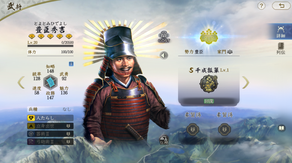 次は豊臣秀吉です。 豊臣秀吉は単体で回復量が1万以上叩き出せる武将です。 これだけの回復をできる武将は他にはいません。 属性値も高く、回復もアタッカーとしても対応できます。 豊臣勢力は福島正則や竹中半兵衛、加藤清正、成田甲斐など アタッカーも豊富で、微課金の人なら仙石権兵衛を使うこともできます 弱点は回復無効と秀吉の回復以上の火力を出せる編成でしょうか。 火力不足な編成には回復量で吸収してしまうので、 微課金編成には強みがあります。