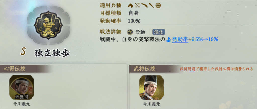 独立独歩で乗勝追撃の発動率は49%まで上昇します。長宗我部元親+Any武将(独立独歩+乗勝追撃)の組み合わせは乗勝追撃の期待火力を最大化できるかと思います。
