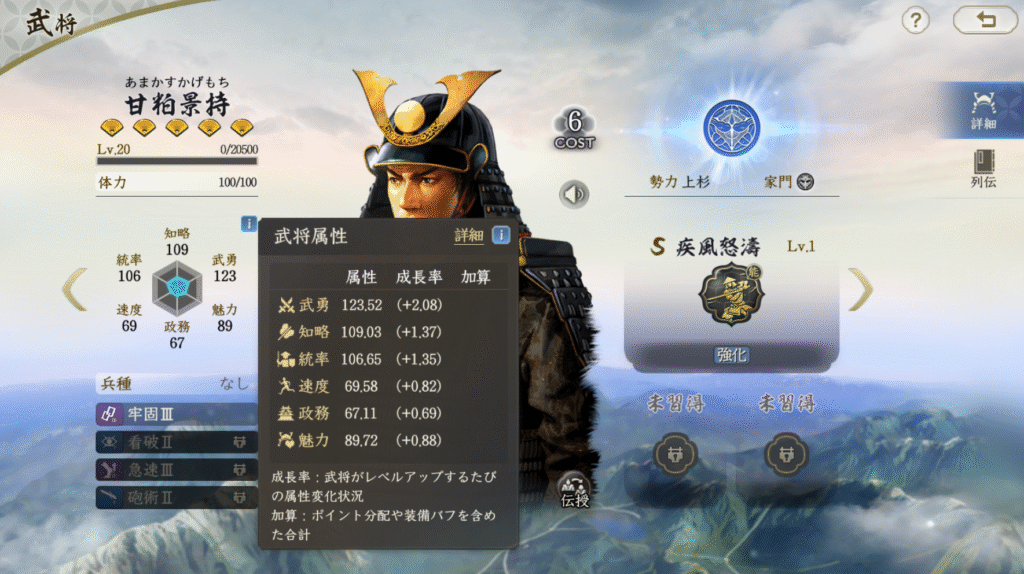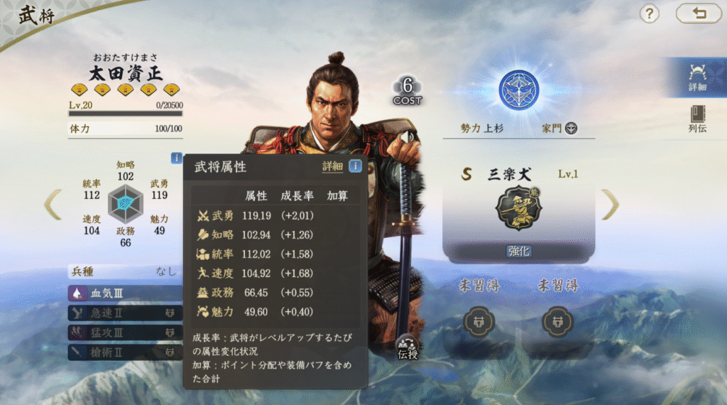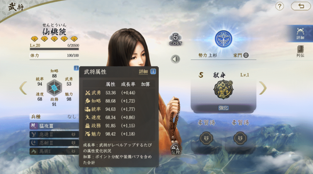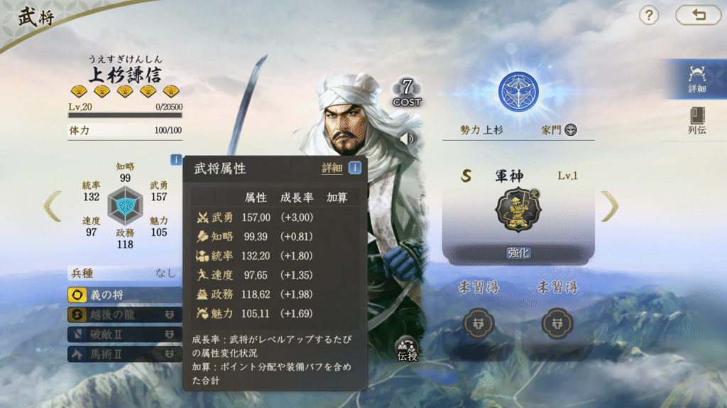上杉謙信(気勢衝天+以戦養戦)仙桃院(回天転運+五里霧中/赤備え)甘粕景持(所向無敵+一行三昧)