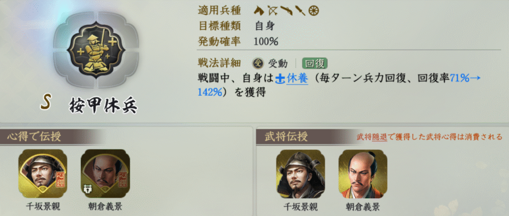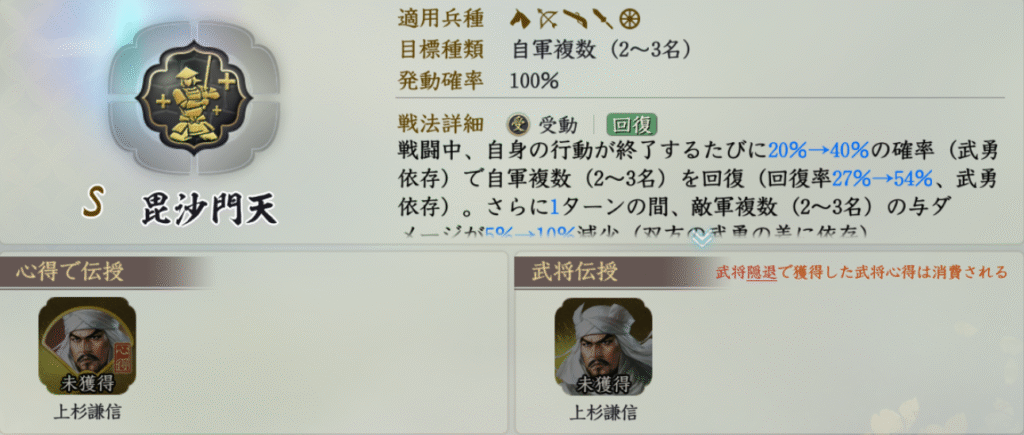 自身の行動が終了するたびに40%の確率(武勇依存)で自軍複数(2~3名)を回復(54%、武勇依存)。