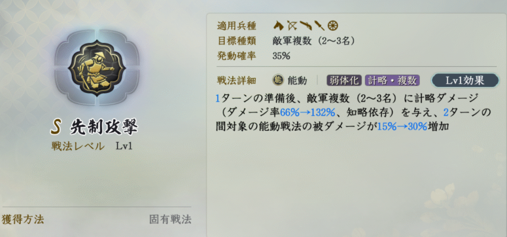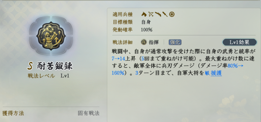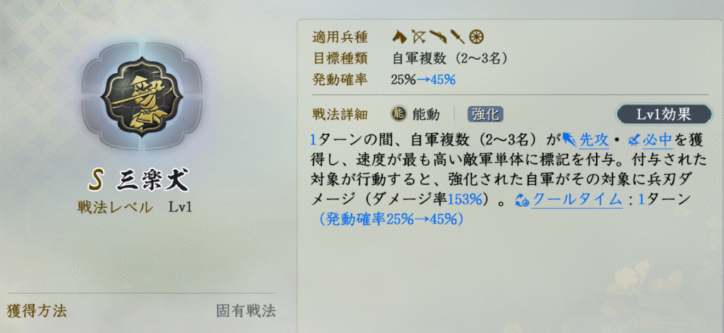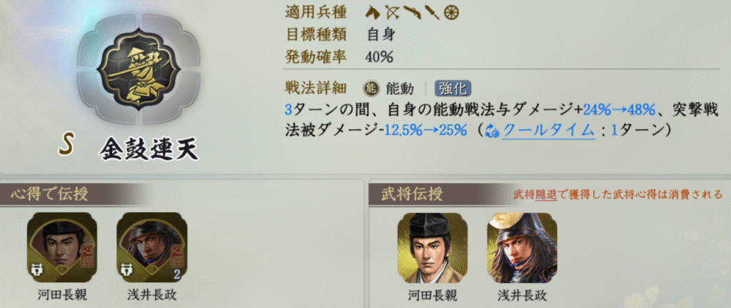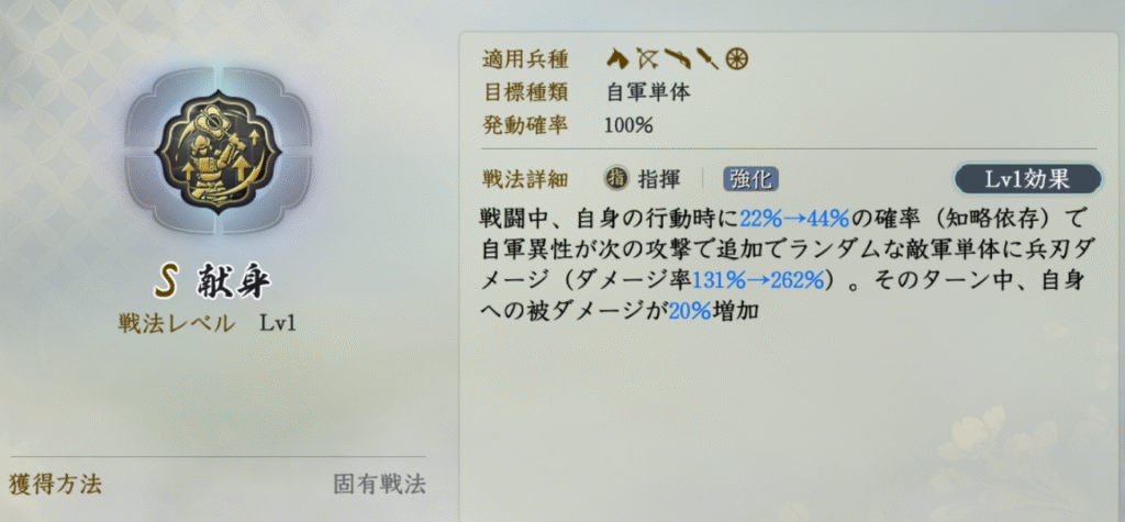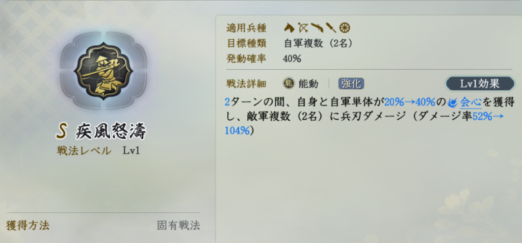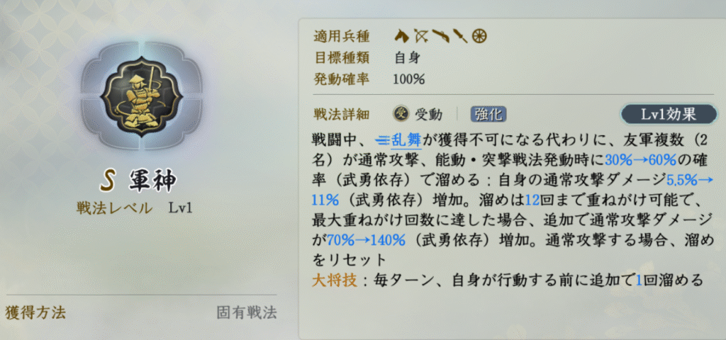友軍複数(2名)が通常攻撃、能動・突撃戦法発動時に60%の確率(武勇依存)で溜める