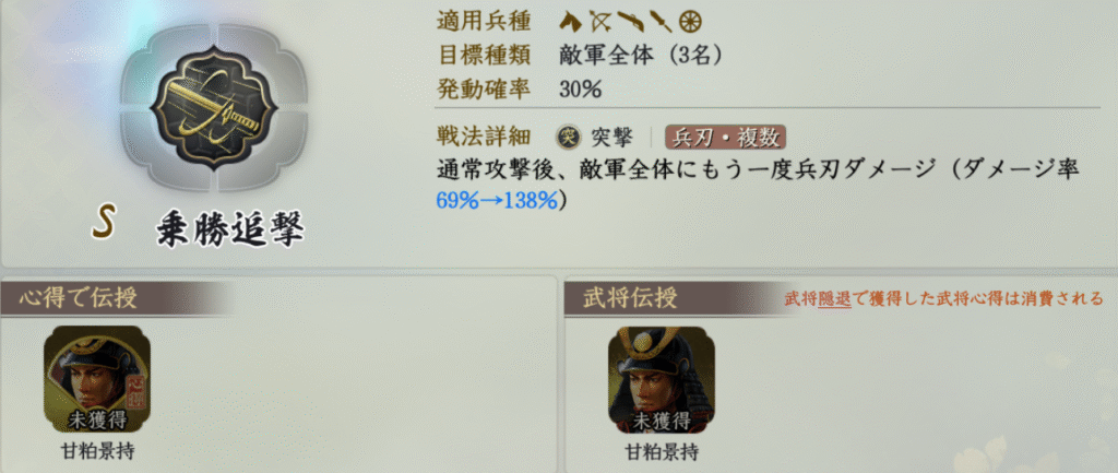 通常攻撃後、敵軍全体に兵刃ダメージ(ダメージ率138%)