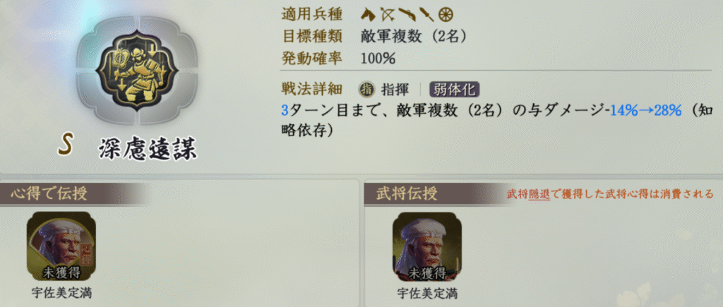 更に1ターンの間、敵軍複数(2~3名)の与ダメージを10%減少(双方の武勇の差に依存)