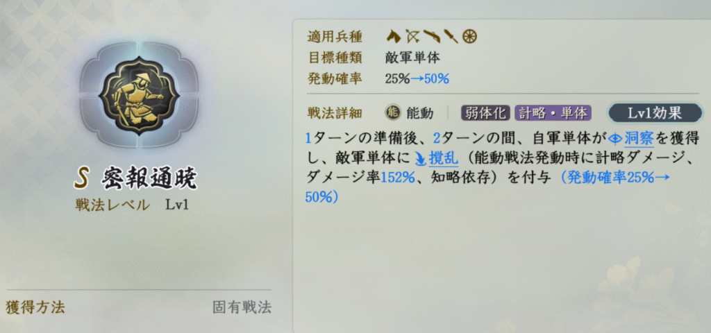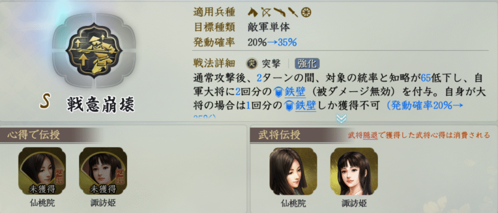 会心を獲得してから兵刃ダメージを与えるので悪くはありません。しかし、会心付与を自軍で最も高い武勇を持っている武将など対象を指定できるか、ダメージ率がもう少し高ければ使えますが、ややスペックは低いので使いにくいかなと思います。