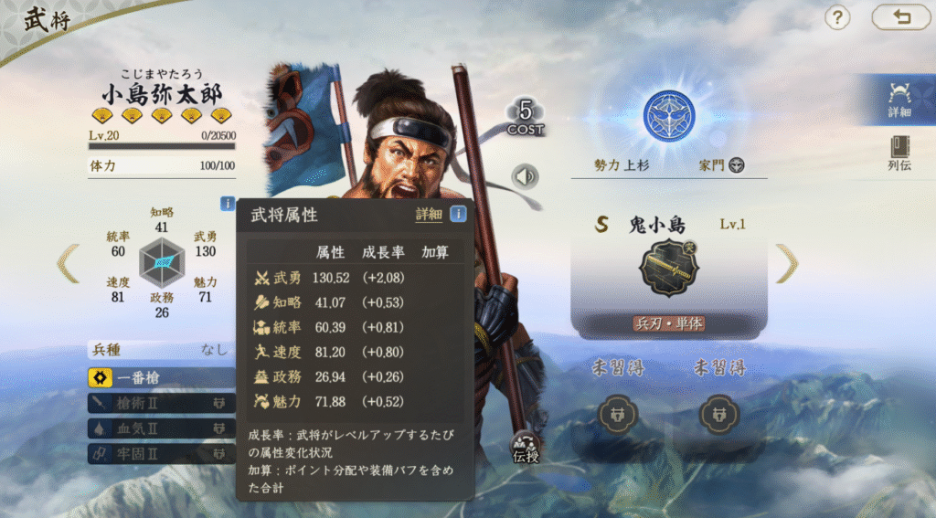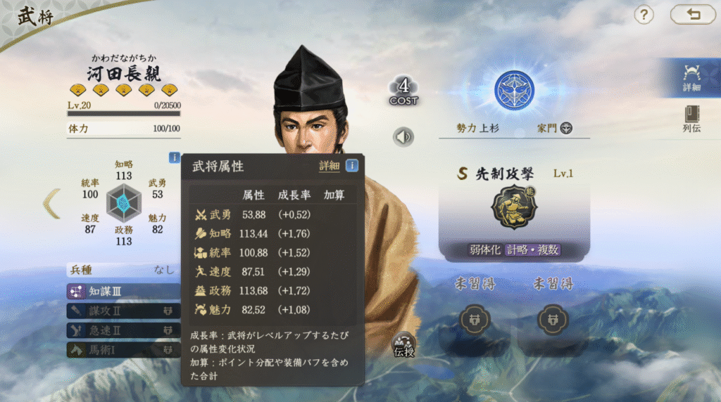 上杉謙信(気勢衝天+陣形崩し/赤備え)宇佐美定満(帰還の凱歌+大智不智)小島弥太郎(前後挟撃+乗勝追撃)