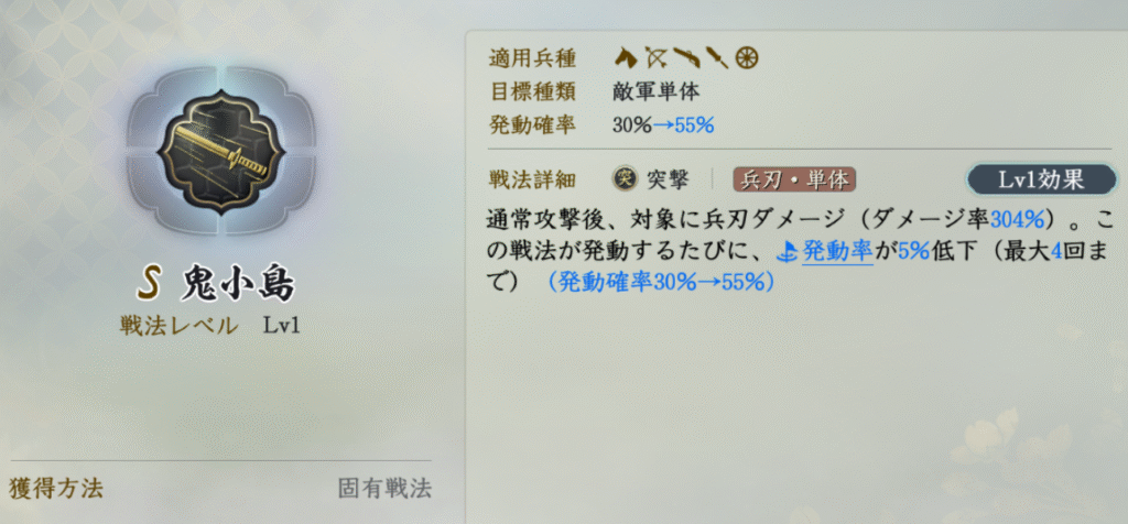 敵全体へ大ダメージを与えます。突撃戦法なので、連撃(長宗我部元親や前後挟撃等)で発動機会を増やしたり、独立独歩で発動率を増加させると発動回数を増やせます。本多忠勝なら固有戦法で反撃時に乗勝追撃を発動可能です