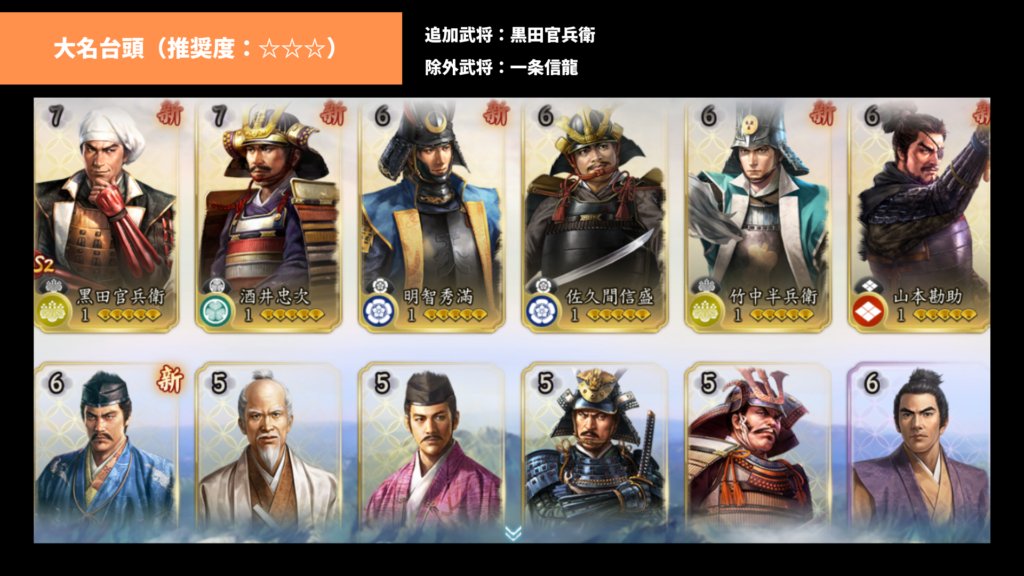 低排出武将は黒田官兵衛、酒井忠次、竹中半兵衛、山本勘助、北条氏康など、ラインナップとしては魅力的です。特に北条氏康はトップクラスに強い補助武将なので、凸数を増やしていきたい武将筆頭です。竹中半兵衛は事件戦法「城盗り」で消費します。山本勘助はS2山県昌景と相性が良く、武田家の主要な計略アタッカー兼補助武将です。