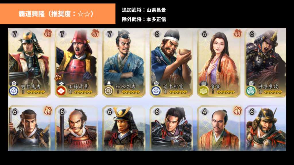 ラインナップとしては準主力編成武将が多く、やや魅力に欠けるでしょうか。