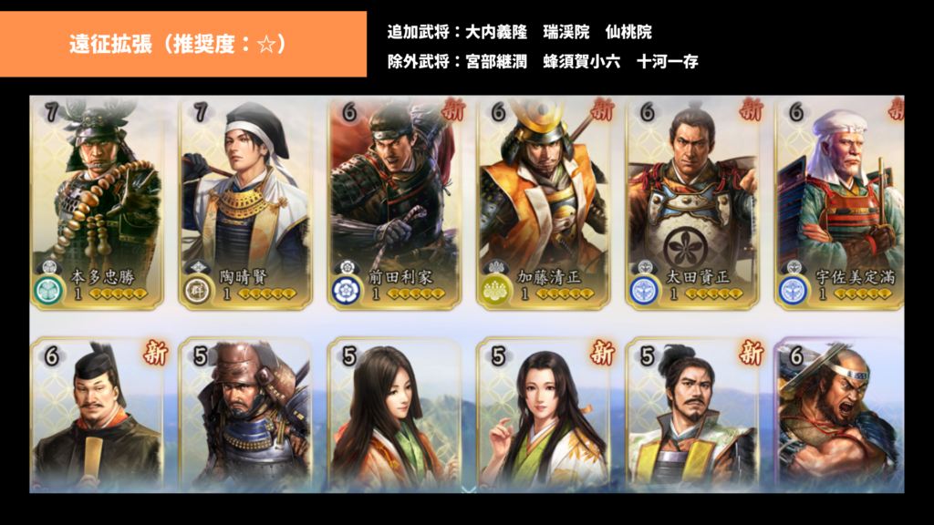 遠征拡張パックでは大内義隆、瑞渓院などのS2武将が追加されています。基本的にはS2限定の新武将狙いはS2シーズン名将ガチャで狙うほうが良いと思います。このパックで狙いたいのは宇佐美定満や加藤清正の凸数を稼ぎたい場合は悪くはないと思いますが、優先順位としてはそれほど高くありません。
