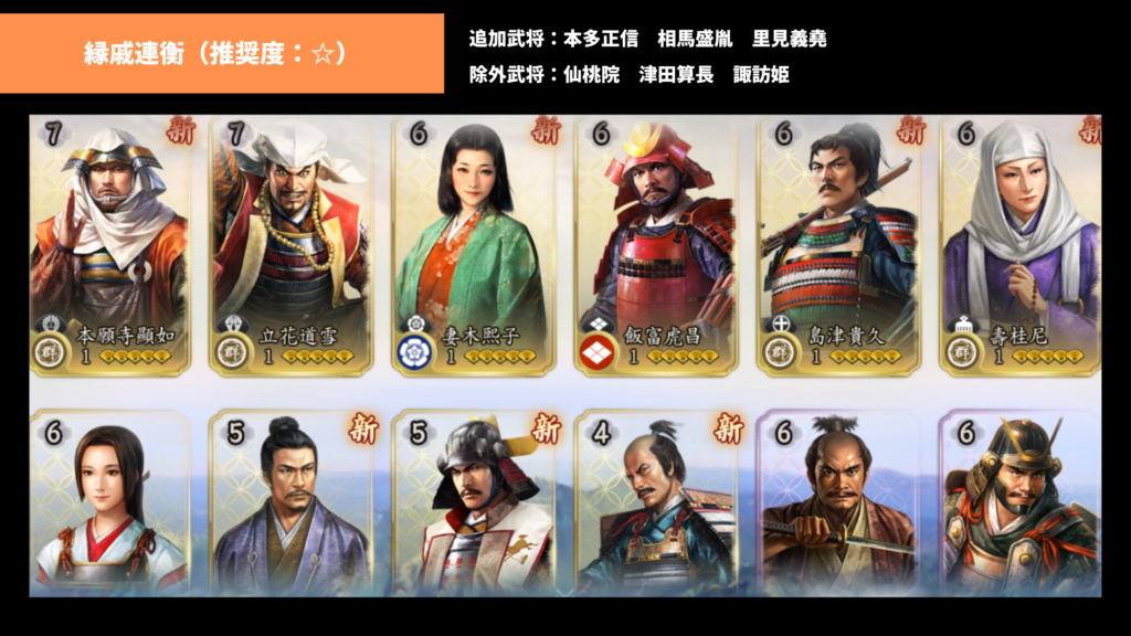 新武将の相馬盛胤と里見義堯が追加されていますが、この2武将をわざわざこのパックで狙う必要はありません。このパックで狙いたいのは本願寺顕如や立花道雪、飯富虎昌などの武将を狙う場合でしょうか。