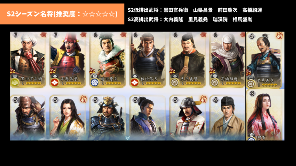 乱世の華や知者楽水などはなくてもなんとかなります。境目奮戦もなくても編成は組めます。なので、非常に狭くガチャ戦略を考えるなら、S2は山県昌景だけ狙う。黒田官兵衛は狙わないってのもある意味で最適解に見えます。