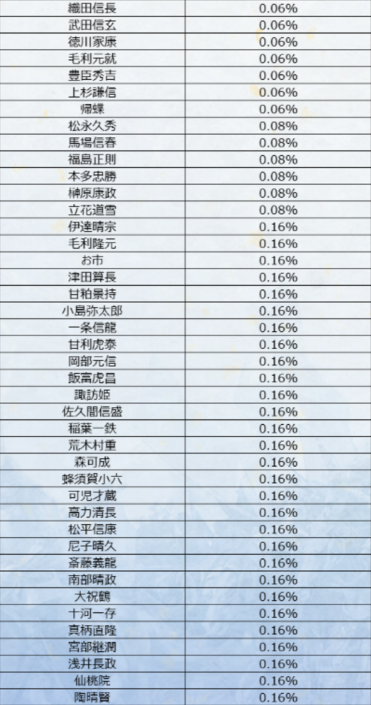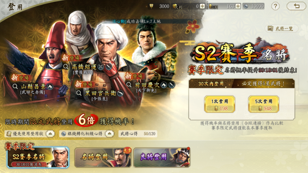 特に引きたいのが、大名武将です。大名武将はその勢力を代表する武将で、今後のシーズンでも腐ることがない武将だと思います。これらの大名武将のランクアップはS2武将を引くよりもシンプルに強度上昇が見込めます。
