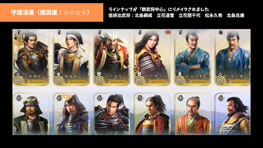 S3守護没落は群武将中心にラインナップされており、群編成を組むなら、このパックを引いておけば1部隊以上は作れます。高排出武将も使える武将が多いため、かなり優秀なパックだと思います。例えば、