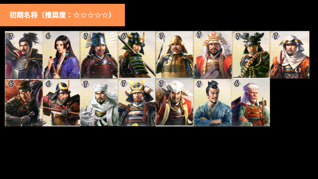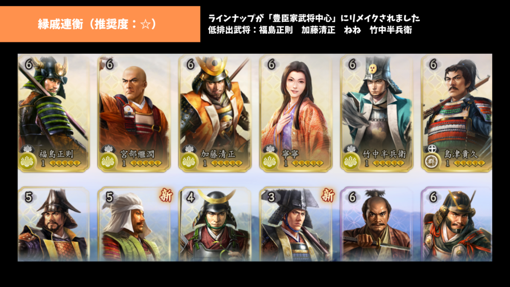 低排出武将にはずれが少ないのも魅力です。あえて言えば、前田利家と福島正則、本願寺顕如(将来性は高いです)、帰蝶あたりはこの中では外れ枠でしょうか。それくらいこのラインナップは強力です。