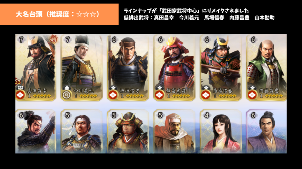 武田家中心のパック内容にリメイクされています。目玉は真田昌幸だと思います。ただ、真田昌幸狙いならS3シーズン名将ガチャで狙うほうが良いとは思います。このガチャを回すのは回天転運を持っていない人や馬場信春の事件戦法が欲しい場合、今川義元や山本勘助の凸数を確保したいときでしょうか。