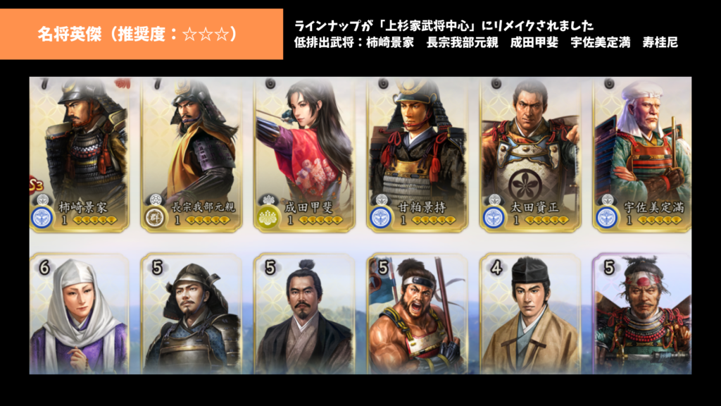 柿崎景家狙いなら、S3シーズン名将を推奨。宇佐美定満狙いなら初期名将で狙うほうが良いでしょう。ただ、上杉謙信編成を主軸にする場合は宇佐美定満または太田資正、柿崎景家の凸数が重要になります。基本的に上杉謙信編成は二通りに分類されると思います。