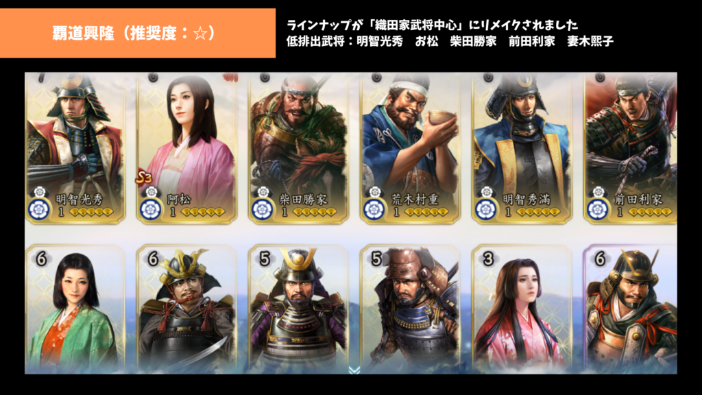 低排出武将は明智光秀、お松、柴田勝家、前田利家、妻木熙子の5武将。お松はS3シーズン名将で狙うべきです。それ以外がやや魅力に欠けるラインナップに感じます。妻木熙子は編成幅がまだまだ狭く、Tier2程度の編成に入る程度です。