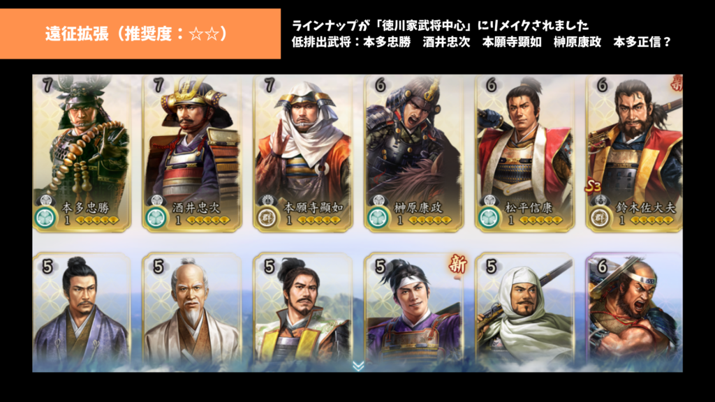このパックは低排出武将が本多忠勝、酒井忠次、本願寺顕如、榊原康政、本多正信(高排出の可能性あり)と推定されます。本多正信は高排出扱いで天下布武ガチャパックでは扱われていたため、S3ではどうなるかがわかりません。