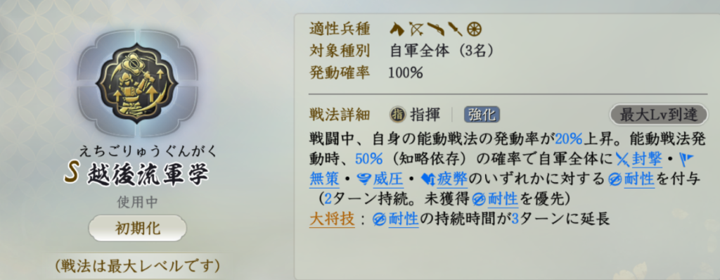 回天転運や祓除は混乱している場合は敵武将を対象にする場合があるため、不確実ではありますが、使える浄化戦法だと思います。達人大観や心頭滅却といった兵学浄化はS3ではより有用になってくると思います。個人的には機動で速度上げがかなり気に入っているので、兵学浄化もセットで活用する機会が増えそうです