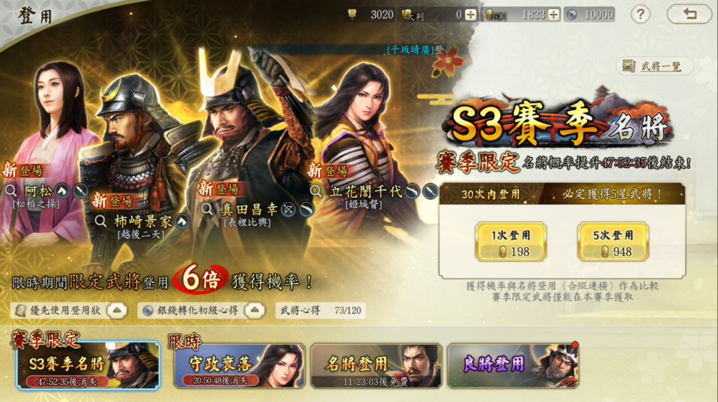 天下布武のガチャパックが完全にリメイクされ、より初期名将の重要性が際立つ内容になったと思います。S3限定武将はS3でしか引けないため、基本的にはS3シーズン名将を最優先で引くべきです。ただ、部隊数を増やそうと思えば、大名武将(織田信長/徳川家康/武田信玄/上杉謙信/豊臣秀吉等)が主軸になるため、大名武将を引くことが戦功を稼ぐ近道になっています。