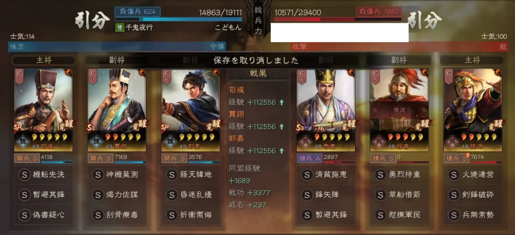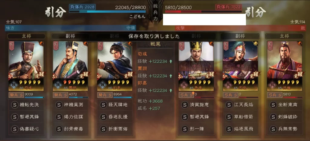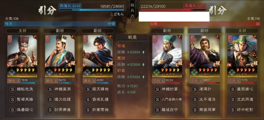 SP荀彧(暫避其鋒+偽書疑心)兵法書:惜兵愛民+防備+守勢 装備スキル:奇略