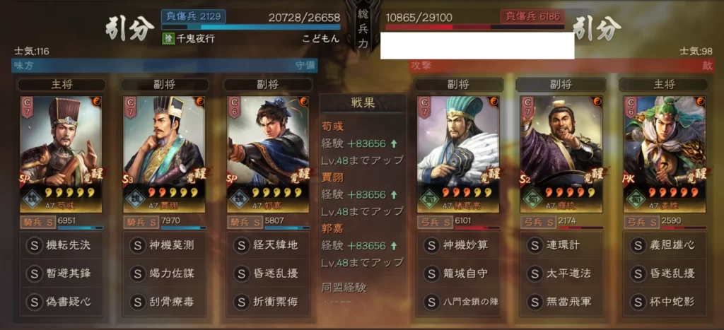 - 援護推奨。賈詡は凸数不足で知力No.1にしにくい場合は他の武将でもOK