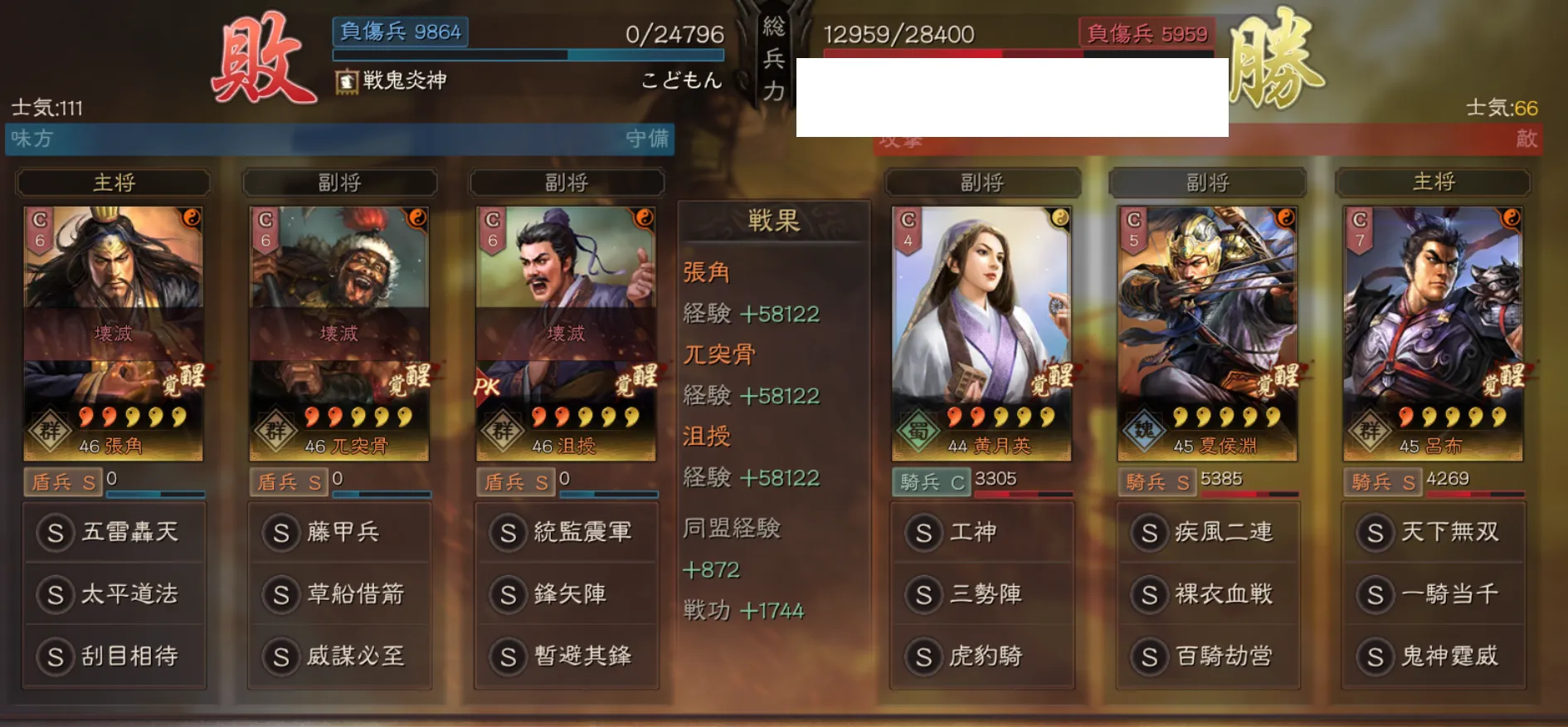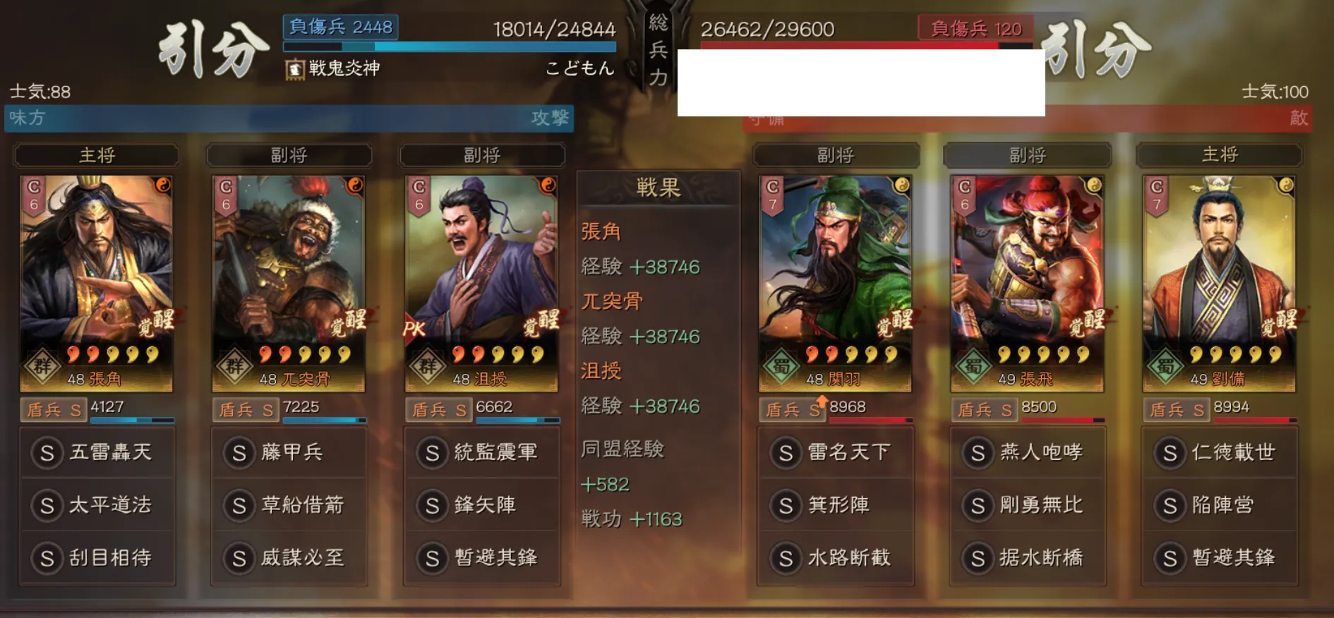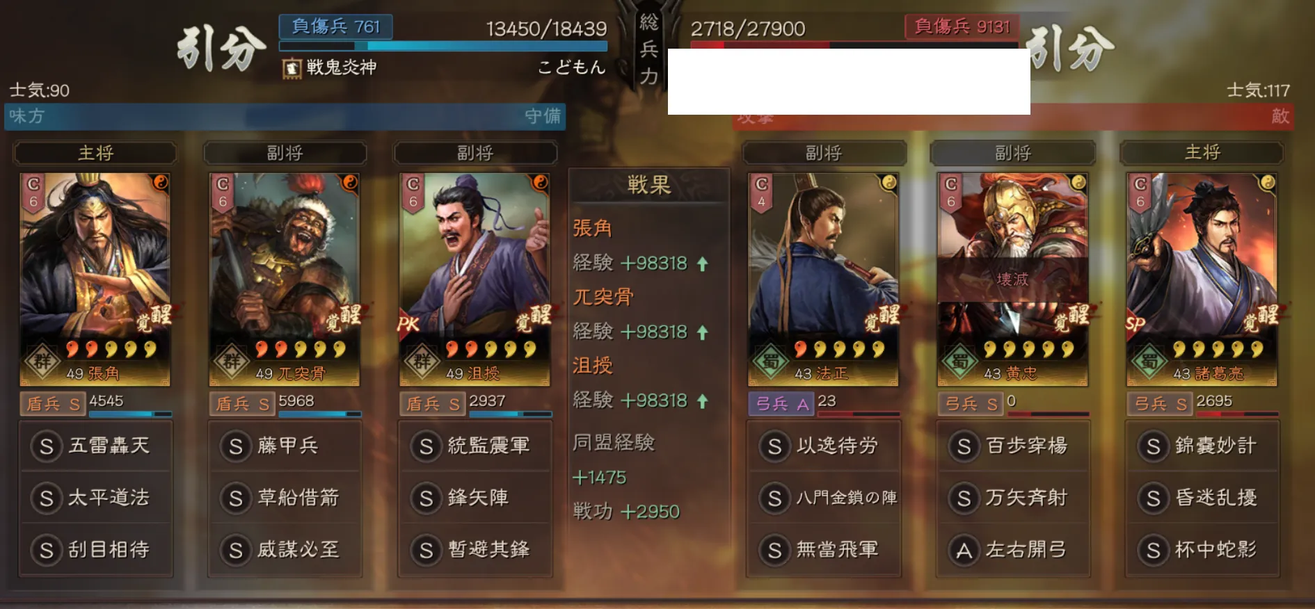 張角(太平道法+刮目相待)兵法書:疾戦突囲+鬼謀+将威 代替戦法:神算鬼謀/その他計略ダメ戦法 装備:天公スキル