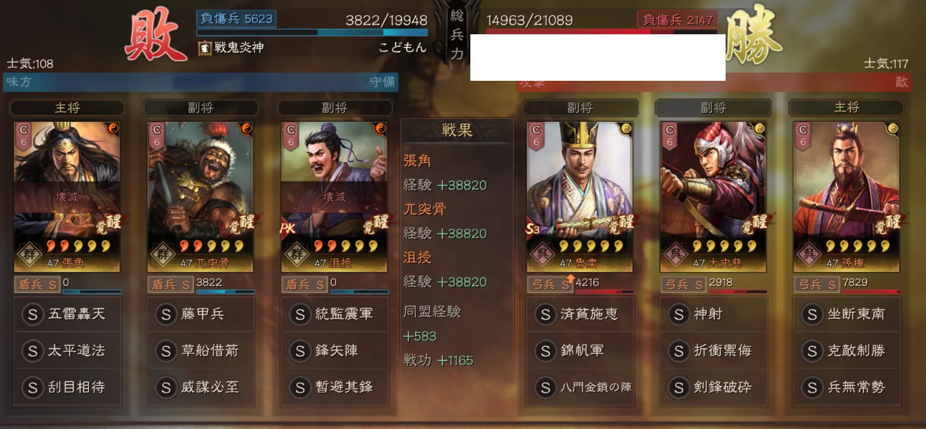 張角は専用の装備品スキル「天公」があれば更に火力期待が持てます。私は天公を持っていないですが、それでも充分な火力だと思いました。シーズン7以降では張角の専用装備が更に増えます。