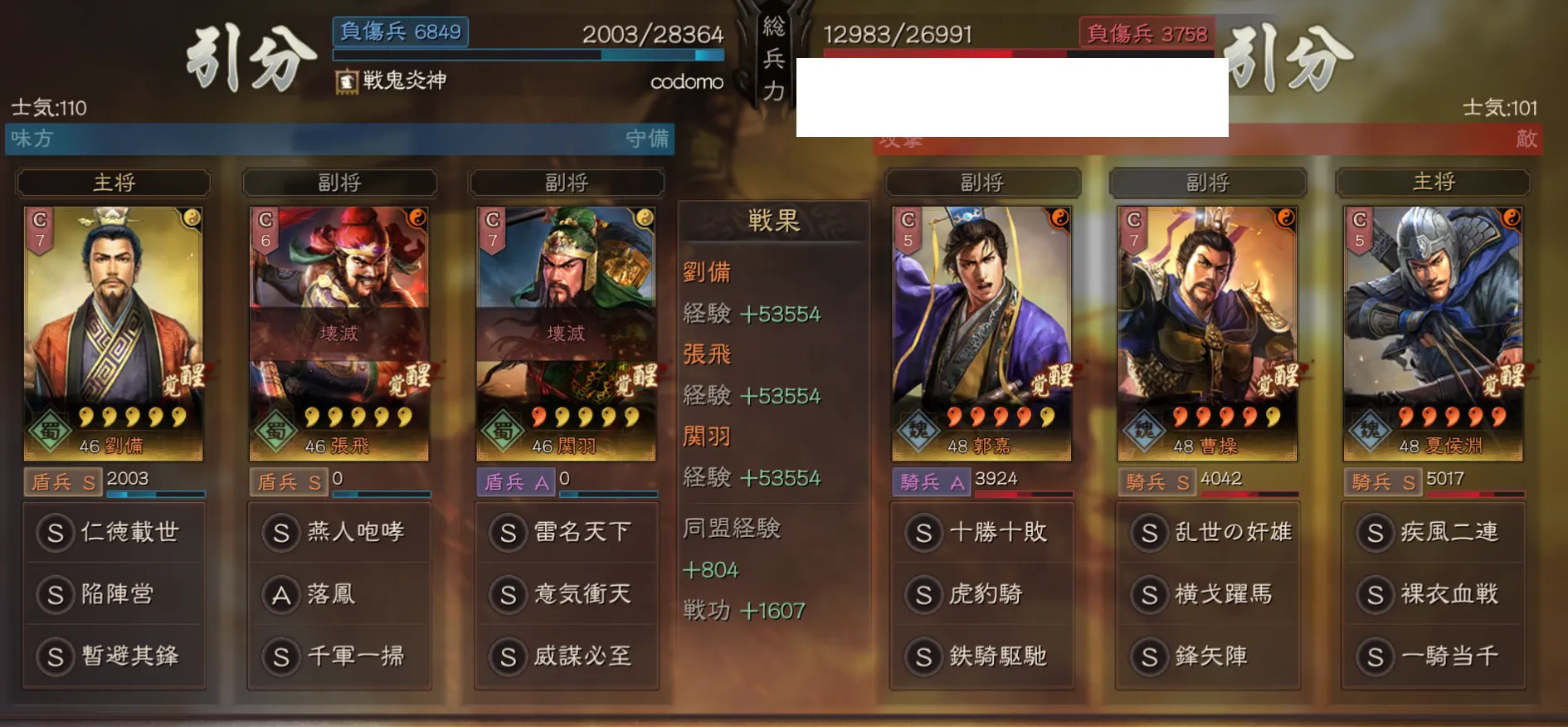 意気衝天入りの桃園盾のため、封印付与が有効な連撃編成には勝てている戦歴が多いです。奸雄騎にも勝利しています。ただ、箕形陣のほうが安定した戦歴は出せるかもしれません。郭嘉入りの編成の場合は洞察で無効化され、呂布三勢陣の場合は固有発動による通常+突撃を防げません。ただ、不利兵種相手に十分な戦果は出せていると評価しています。